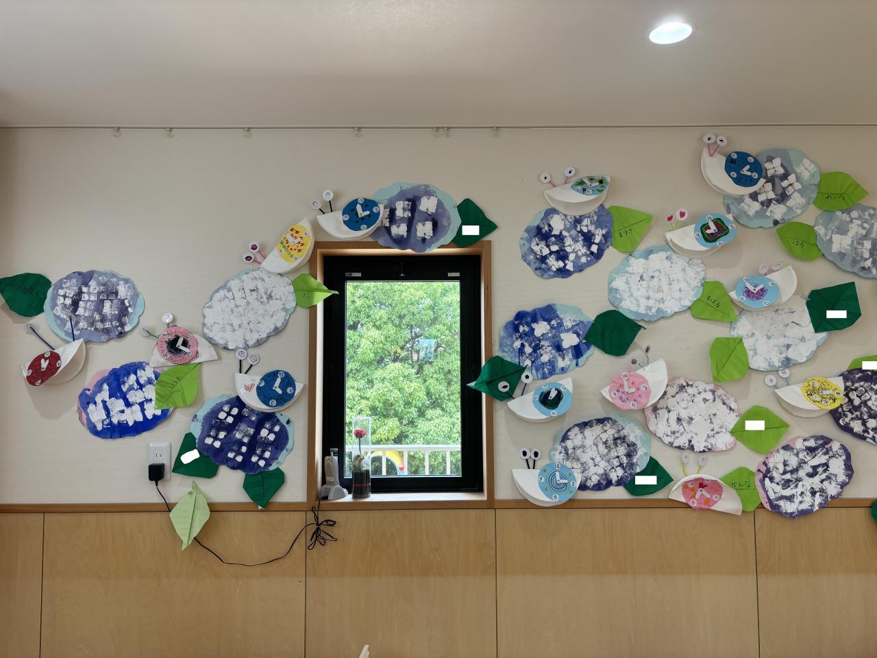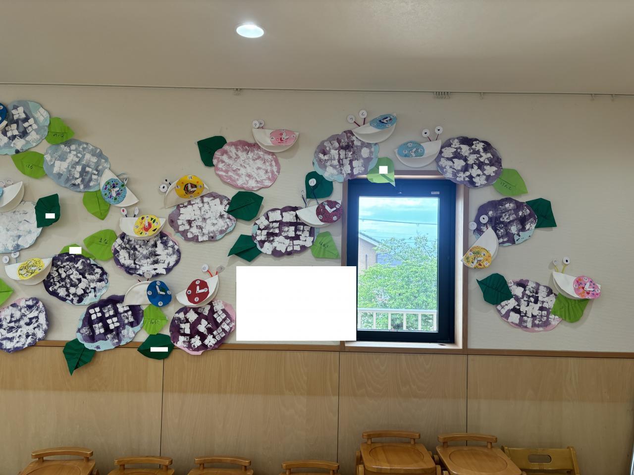ひまわり組さんの壁面製作「紫陽花とかたつむり」です。