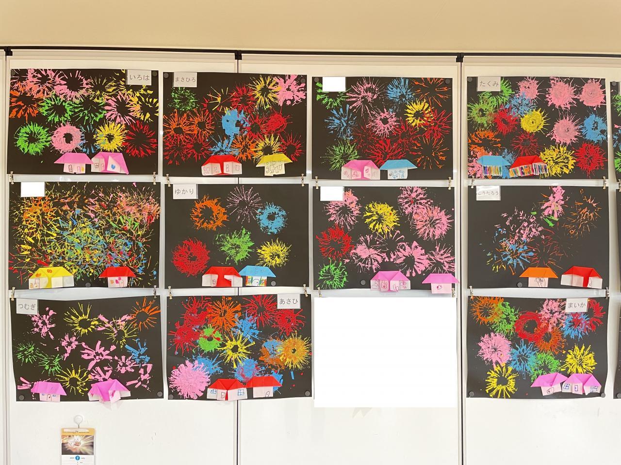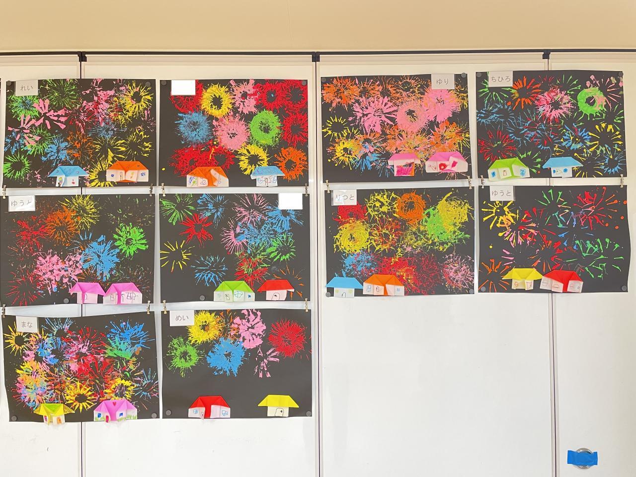 花火はトイレットペーパーの芯に切り込みを入れ、切り込み部分を外側に広げ、絵の具でスタンプをしました!