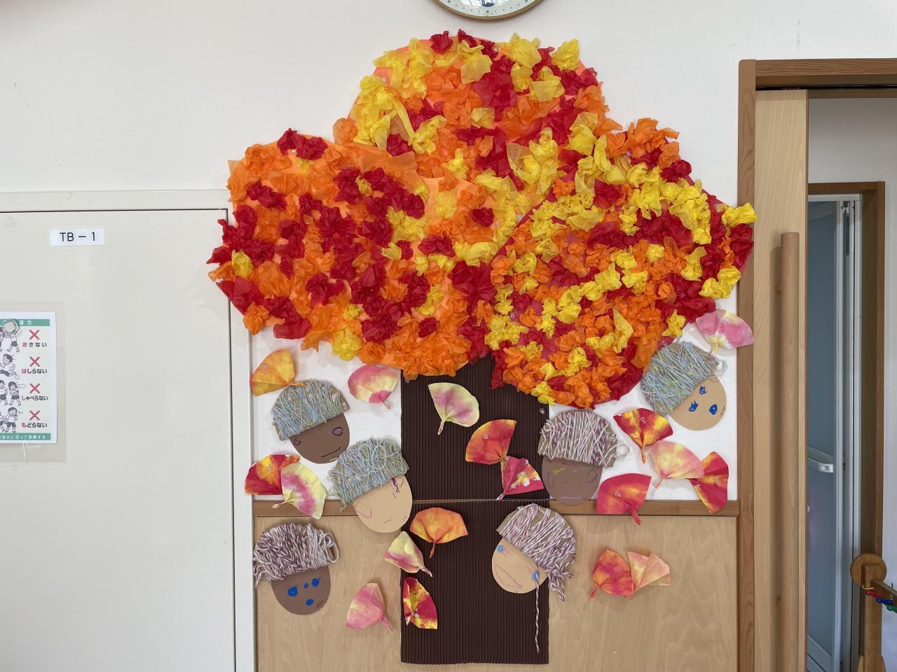 だんだんと涼しくなり、秋らしい季節になりましたね。ひよこ組さんのお部屋も紅葉とどんぐりが飾られ、一気に秋らしくなりました♪