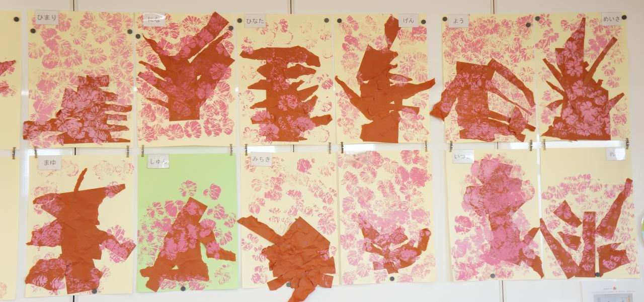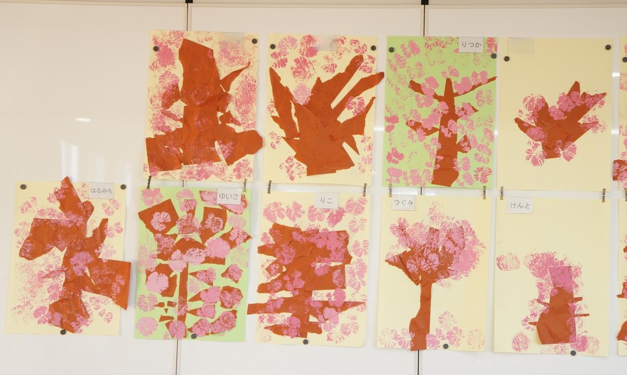 桜の花びらは、ふくらましたビニール袋に絵の具をつけスタンプにしました。