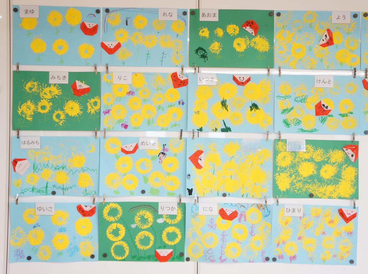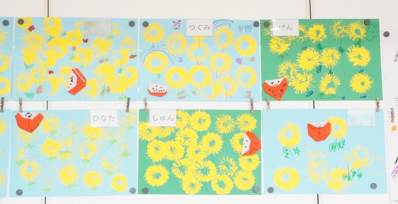 タンポポはトイレットペーパーの芯の先を細かく切ったものでスタンプをしました。