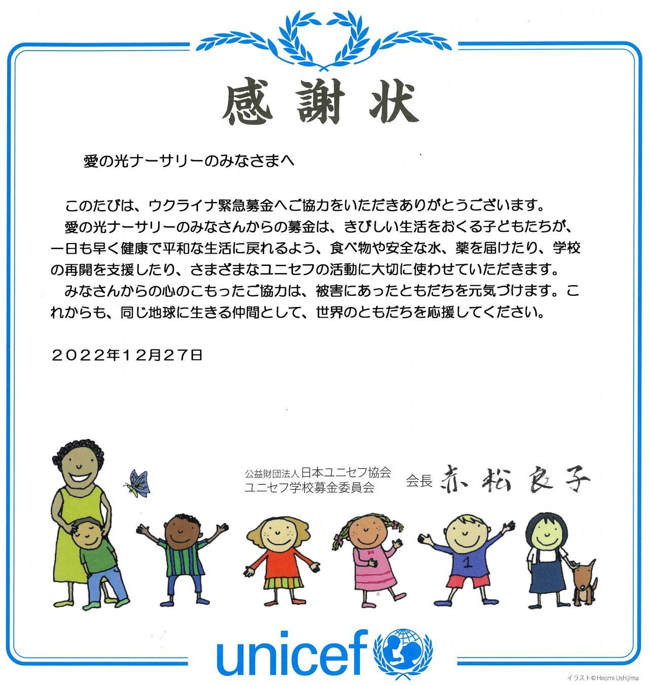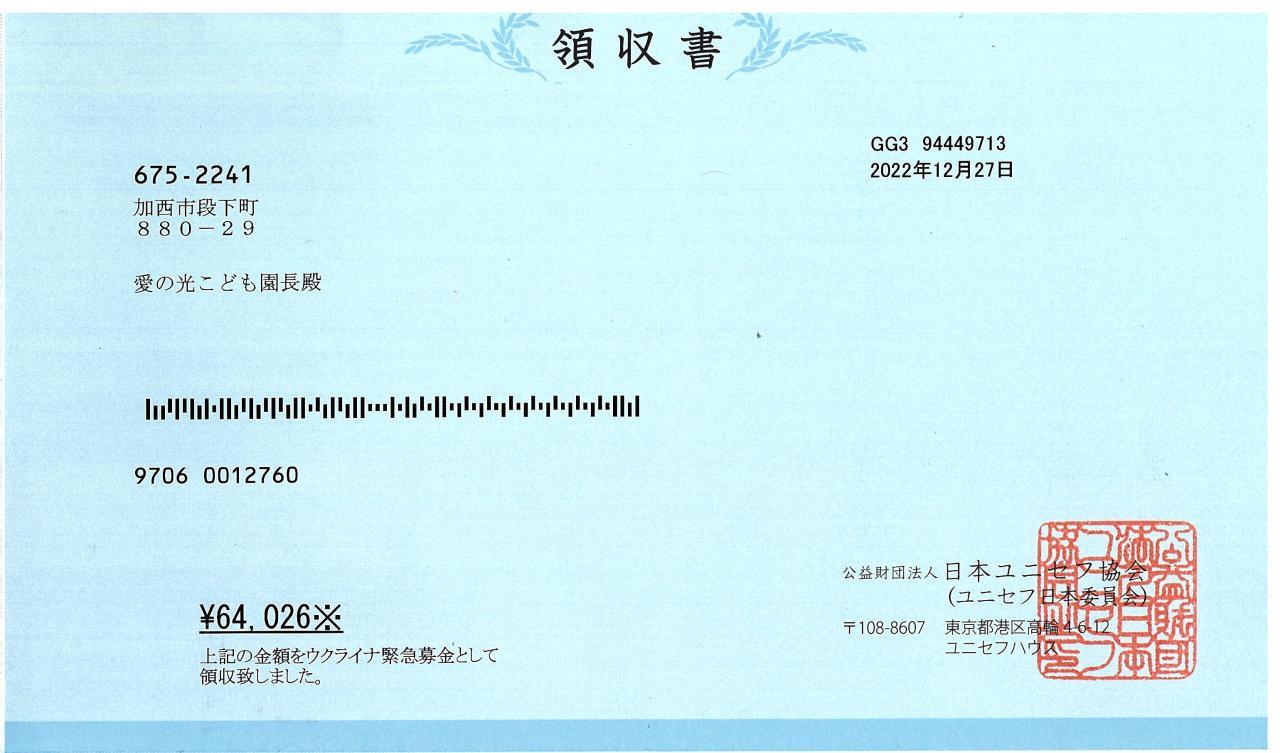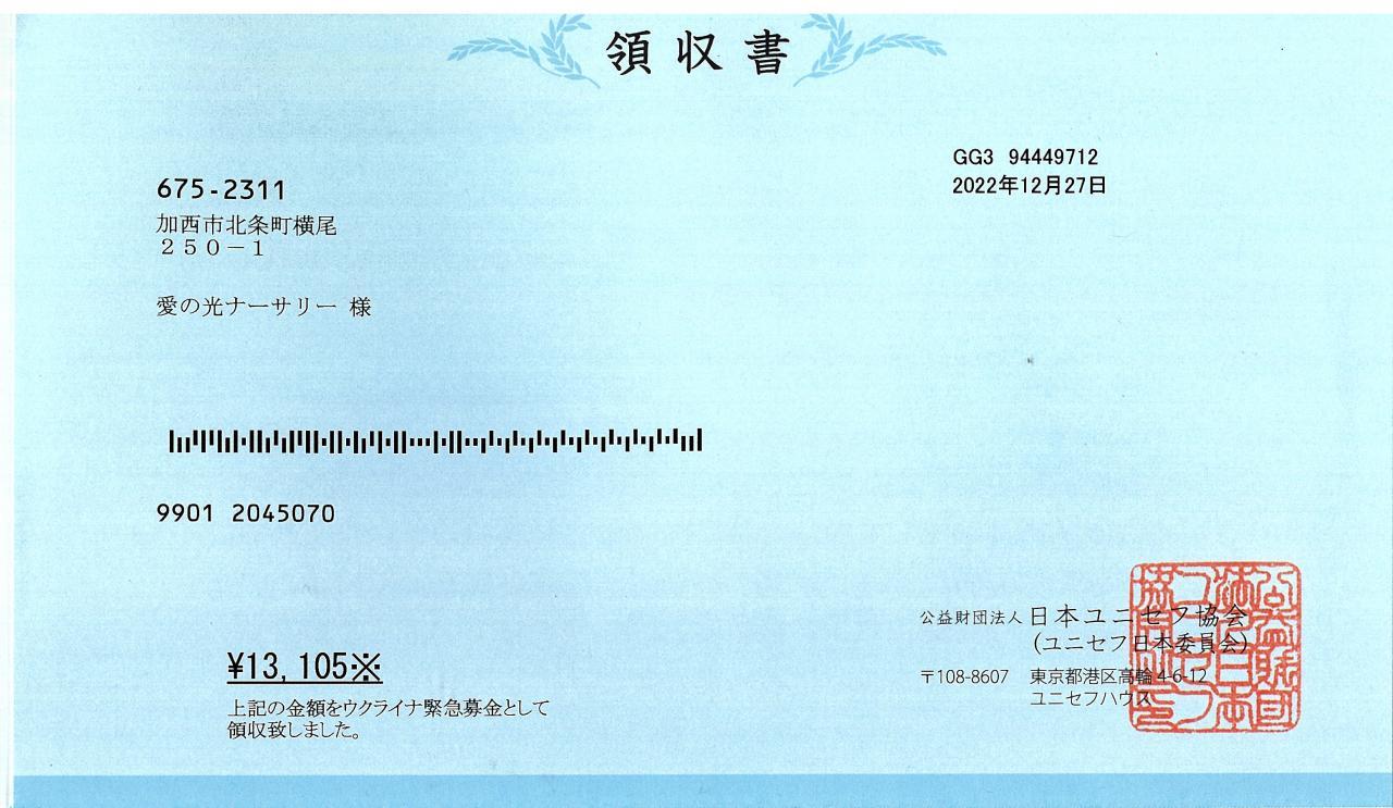 クリスマス礼拝にて、保護者の方々にもご協力いただきました、『ウクライナの子ども達への緊急募金』の領収書と感謝状が、ユニセフより届きました。
